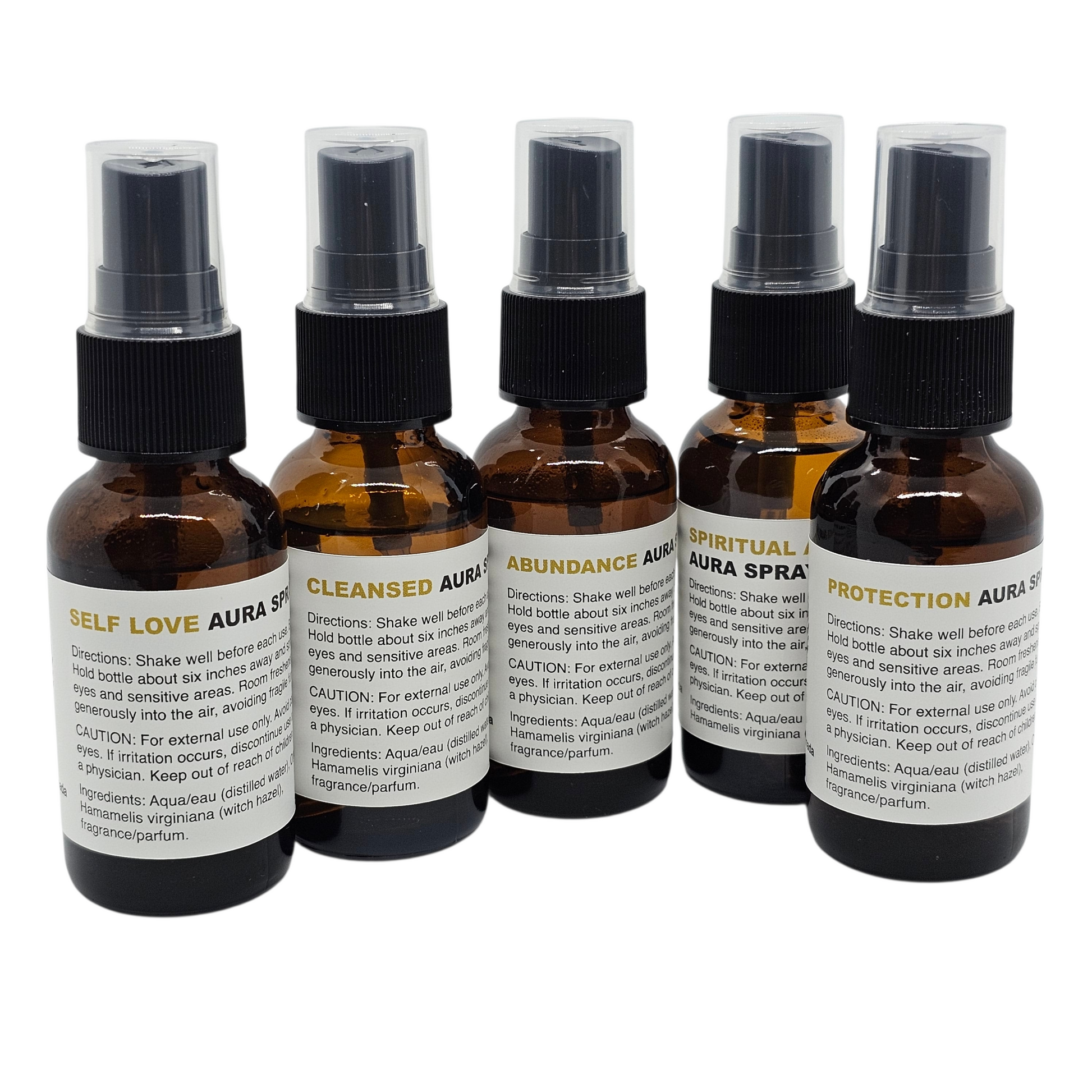 Set includes: Spiritual Awakening Aura Spray, Protection Aura Spray, Abundance Aura Spray, Self Love Aura Spray, Cleansed Aura Spray.